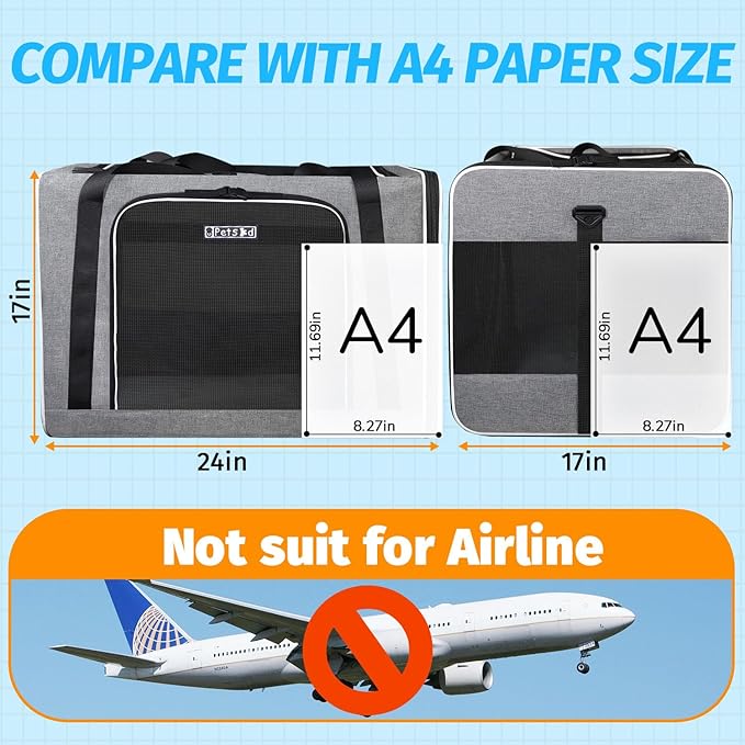 Petskd Extra Large Pet Carrier 24"x17"x17" for Large Cat or Medium Dog, Collapsible Soft Sided Dog cat Carrier for Long Trips with Lockable Safety Zippers(Grey)