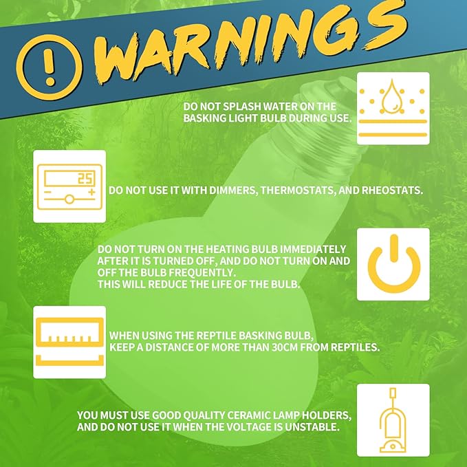 - 🦎SAFETY INSTRUCTIONS - You must use good quality ceramic lamp holders, and do not use it when the voltage is unstable. Do not use it with dimmers, thermostats, and rheostats. Do not splash water on the basking light bulb during use. When using the reptile basking bulb, keep a distance of more than 30cm from reptiles. Do not turn on the heat bulb immediately after turning it off, and do not turn the bulb on and off frequently.