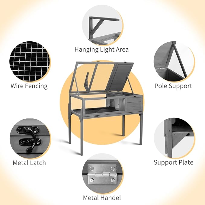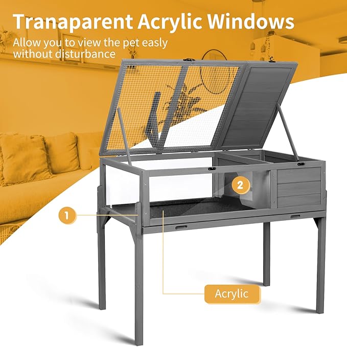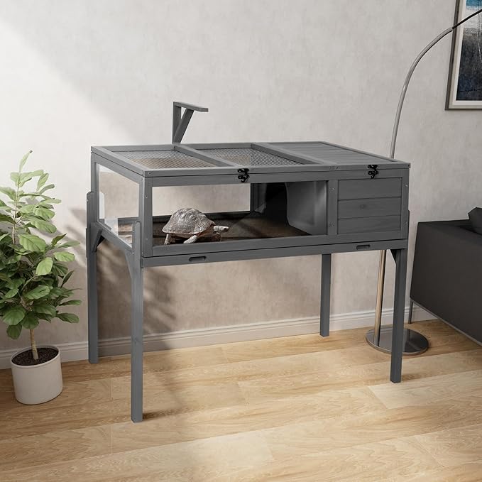 - Ample Space for Small Animals: Enjoy a two-room design with a "private" sleeping area and a "public" viewing area for your tortoise. Detachable legs offer flexibility, allowing placement on tables or the ground. Dimensions: 38”L x 24”W x 32"H (including legs).