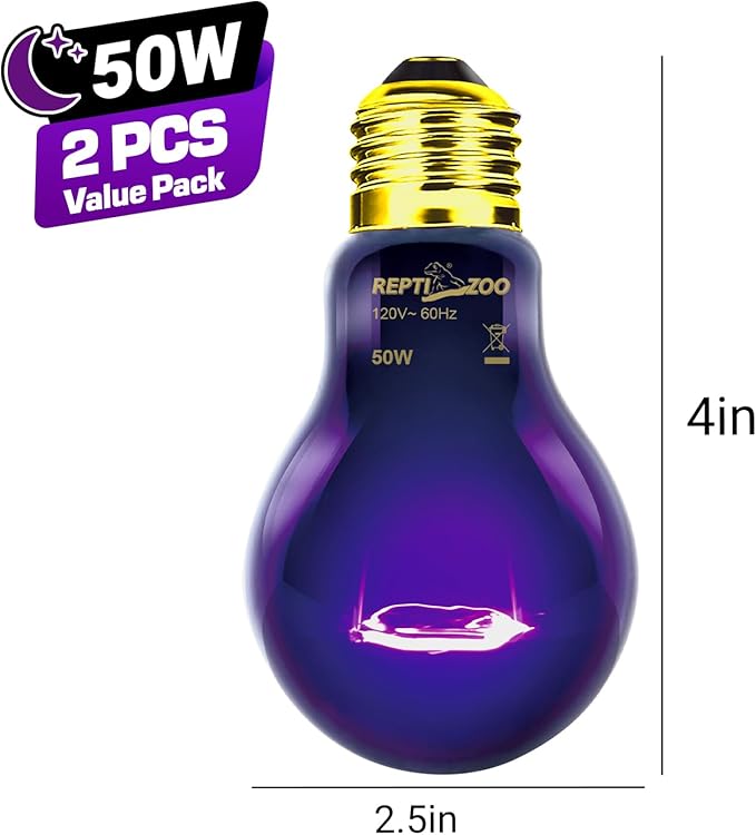 REPTI ZOO 2PCS Reptile Night Heat Lamp, 50W Moonlight Heat Bulb Infrared Heating Light Purple Reptile Heat Lamp Night Bulb for Bearded Dragon, Lizard, Snake, Turtle
