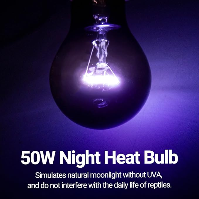 - 【Widely Use】Great vale package, including 2PCK 50W night heat lamp. This reptile heat bulb is great for a variety of reptiles and amphibians, such as bearded dragons, turtles, tree frog, iguanas, lizards and more