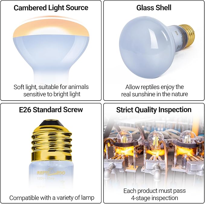 - 【Effective Output】This heat lamp has reflector design, enhance the spectral output and increase the body color deposition of reptiles, while achieving rapid heating. Cambered light source that the light is not harsh, suitable for animals sensitive to bright light