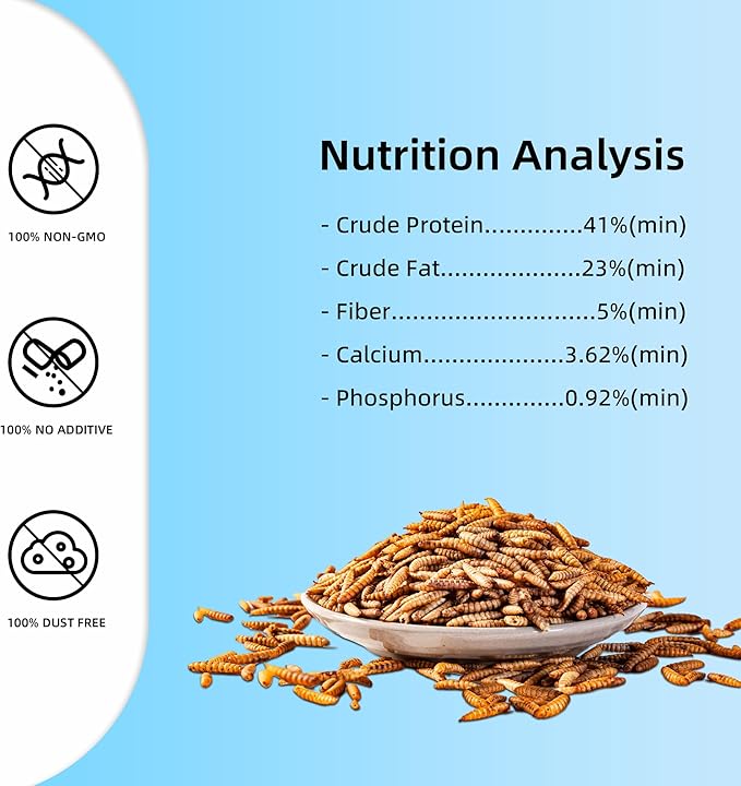 - Black Soldier Fly Larvae is rich in calcium, it’s contain at least 85x more calcium than dried mealworms and with over 41% protein, this high protein treats allows your chickens to eat healthier, lay bigger eggs and produce more, the best chicken treats for laying hens