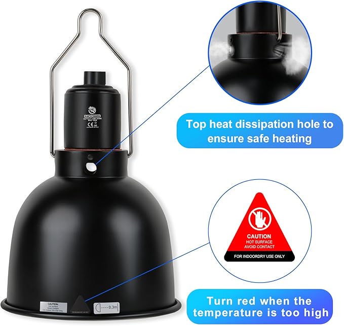 - 【Good Heat Dissipation】:The top vent of heat lamp kit has good heat dissipation effect, this design prevents excessive heat buildup and reduces the risk of reptile burns while providing your reptile pet with basking spot light.