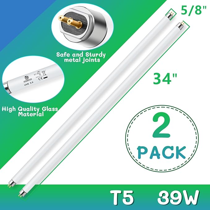 T5 UVB Reptile Light 39W 5.0,UVA UVB Light Bulb for Reptiles,2 Pack Reptile UVB Lamp Tube for Bearded Dragon