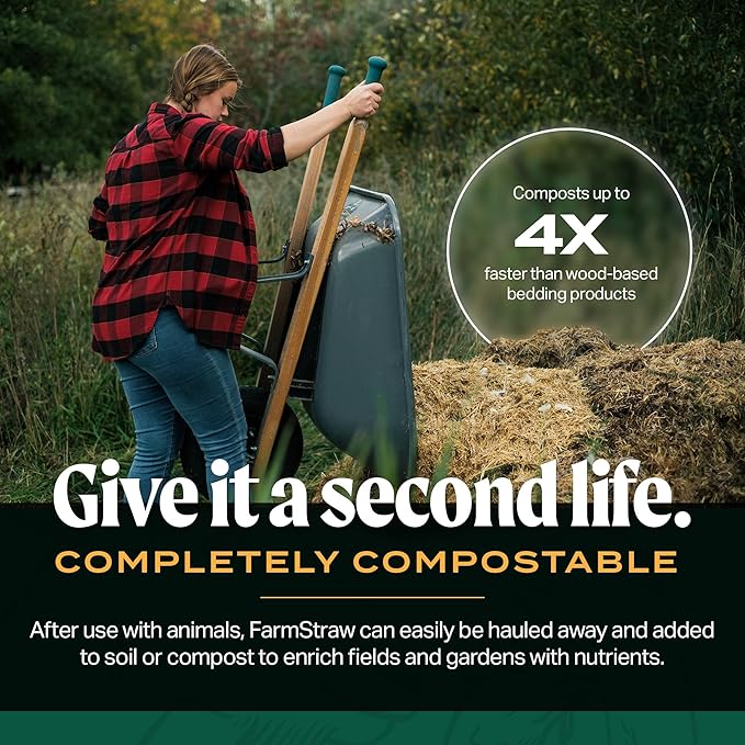 - Compostable: Lightweight and packaged for ease of handling, spreads out, removes and hauls away easily, composts up to 4x faster than wood-based bedding products; once removed, it can be added to the soil to enrich fields and gardens with nutrients