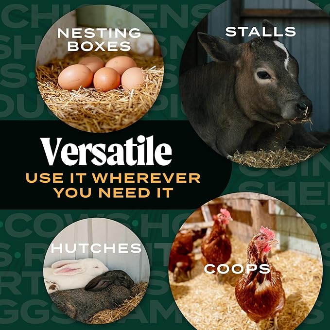 - Coarse cut length: Approx 2-3”, fluffy, provides excellent insulation which makes it ideal for colder climates and muddy conditions, absorbent and effective odor control and is long-lasting; ideal for all farm animals, including chickens, ducks, cows, sheep, goats, pigs, and small pets. Perfect for calving, foaling and farrowing