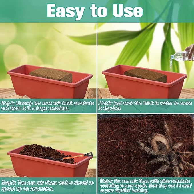 - Super Easy to Use & Store: Just soak the brick in water until it expands and re-constitutes. If it's too wet, let it dry a day or two before using it. The compressed coco coir brick substrate is lightweight, and after swelling with water the coconut coir brick can be bagged up like nutrient soil. NOT RECOMMENDED FOR BABY REPTILES DUE TO ACCIDENTAL SUBSTRATE SWALLOWING OR GETTING TRAPPED