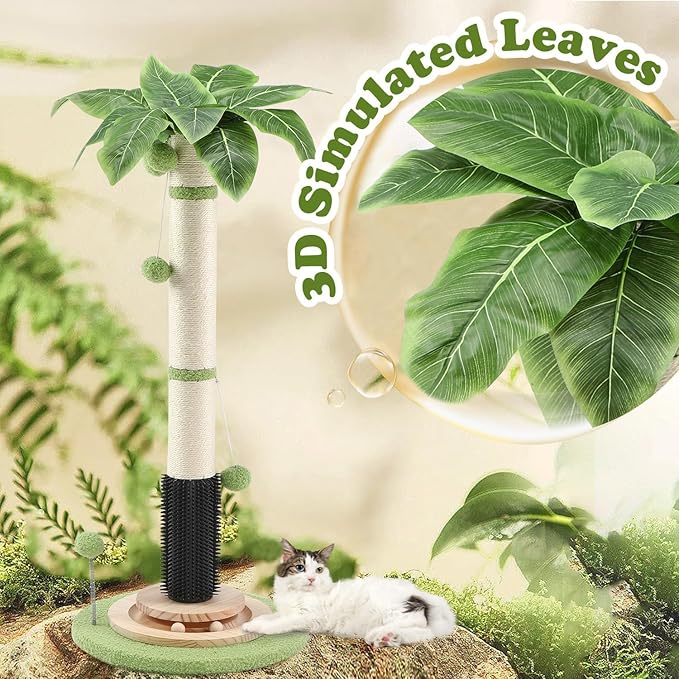 - [4-in-1 Cat Scratching Post] This upgraded cat scratching post has even more features, a sisal-covered cat scratching post, a grommer brush that can be used for massaging and grooming cat fur, a solid wood base, an interactive toy ball, 4 hanging toy balls and 1 spring ball to inspire cats to catch prey like a predator, increasing their playtime and bringing them more fun.