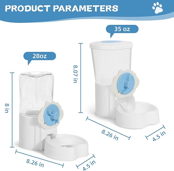 - 【Perfect Capacity】 The food dispenser has a capacity of 35oz, and the water dispenser has a capacity of 28oz. Both can be easily hung in the cage or placed on the ground, suitable for cats, dogs, squirrels, rabbits, hedgehogs, guinea pigs, ferrets, and other small animals.