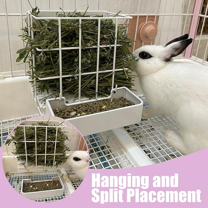 - 【 Easy to eating】 Hay and food two in one multifunctional feeder, with a hanging design, better saves space and can also be placed separately. In addition, it can also be split and placed, with an internal sloping design below the rear bumper, which pushes the hay forward and makes it easier for pets to eat