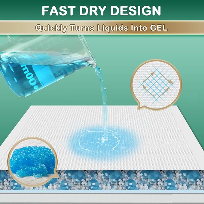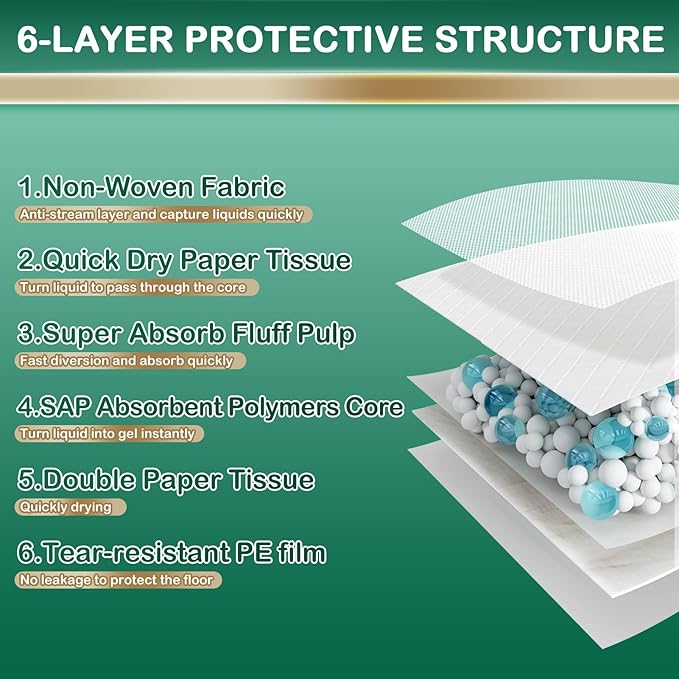 - 【Super Absorbent】Our puppy pads feature a 6-layer thicker design and a super absorbent core to help absorb moisture better. These wee wee pads for dogs can hold nearly 8 cups of urine.