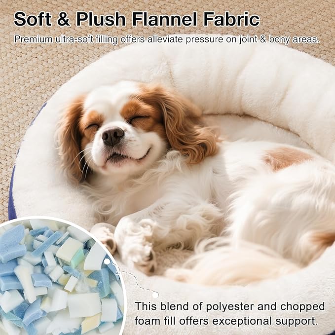 - Donut Cuddler Shape: The round dog bed allows pets to curl up while the raised rim creates a sense of security and provides head and neck support. Premium ultra-soft filling offers joint and muscle pain relief, is a great choice for elderly or sick dog pets. The 25 inch round pet bed is perfect for cat or puppy and other pets up to 30 lbs.