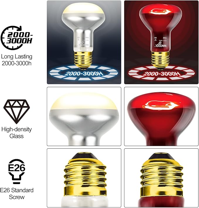 - 【Lifespan Up To 3000H】Both of The reptile heat lamp bulbs adopts upgrade fully automated process, the service life is up to 2000-3000 hours, to ensure your normal use, please use for 120 volt E26 base. Each heat bulb is strictly tested as 4-stage inspection, appearance inspection, 20 sec lighting test, 30 min aging test and 2 times pulse voltage.