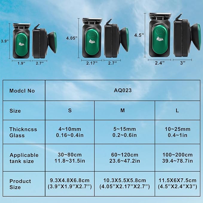 - STRONG MAGNETIC : Made of strong rare earth magnet, durable and convenient. Stronger and more powerful magnetic force. Just move the outer magnet, the inside magnet follows, cleaning the floating algae faster and easier. Size Small suitable for fish tanks with thickness of no more than 1/4", Size Medium suitable for fish tanks with thickness of 1/4 "-3/8 ", Size Large suitable for fish tanks with thickness of 2/5"-4/5"