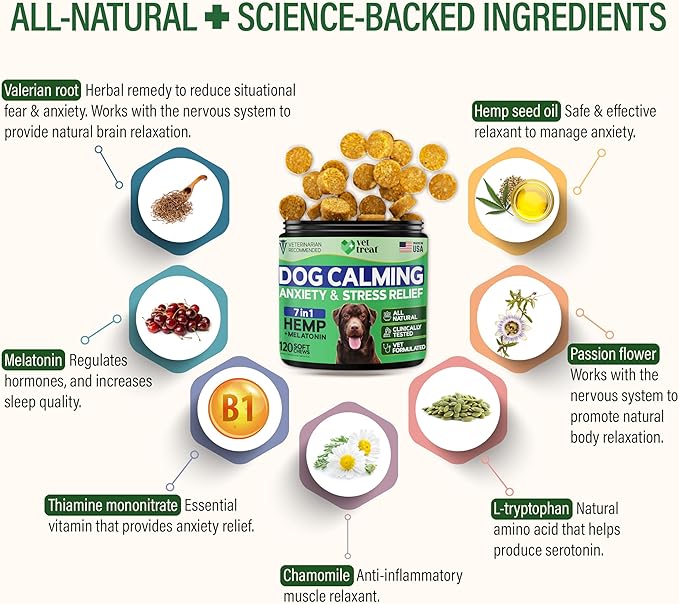 - Effective Anxiety & Stress Relief for Dogs: Vet Treat hemp calming chews for dogs anxiety provide advanced stress relief by helping reduce barking, hyperactivity, separation anxiety, and nervous behavior during thunderstorms, fireworks, or travel. Vet Treat's Natural calming chews for dogs hemp calming treats are perfect for helping your dog stay calm when left alone at home.