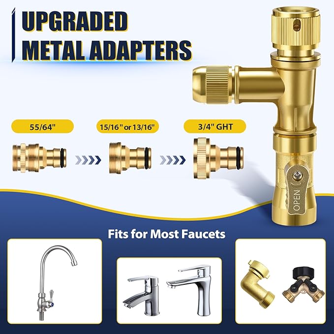 - 【Suitable for Most Faucets】The package comes with 3 metal adapters: a 3/4" GHT garden hose adapter, a 15/16" threaded faucets adapter, a 55/64" threaded faucets adapter, a 13/16" threaded faucets adapter, and it is suitable for all quick connectors.