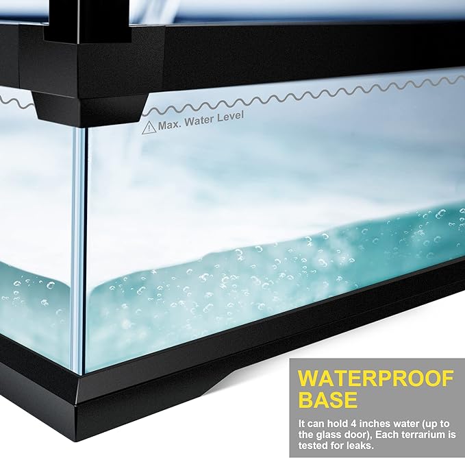 - - Waterproof:It can hold 4 inches water (up to the glass door), Each terrarium is tested for leaks.
