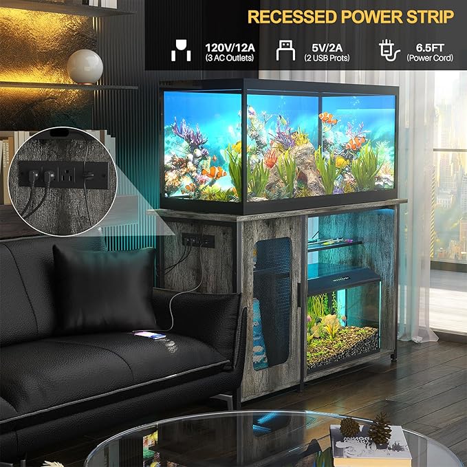 - Magic Power Outlets & USB Charging Ports: The Fish Tank Stand includes a built-in power strip with 3 outlets & 2 USB Ports, which provides convenience for charging heater rods, filters, LED lights, and other devices, avoiding cluttered wires, simplifying your fish tank management.