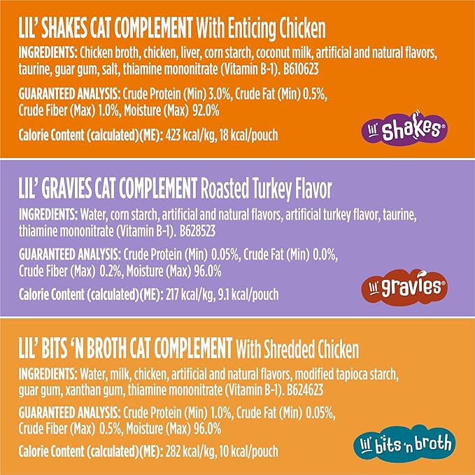 - Cat food topper variety pack in enticing chicken or roasted turkey cat food complement flavors