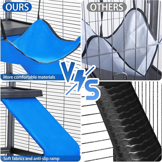 - [Multiple functions]: equipped with 5 amusement platforms of different heights, with slopes and blue flannel, to facilitate up and down and avoid their injuries, and a hanging hammock on the top of the cage.This guinea pig cage provides them with a place to play.