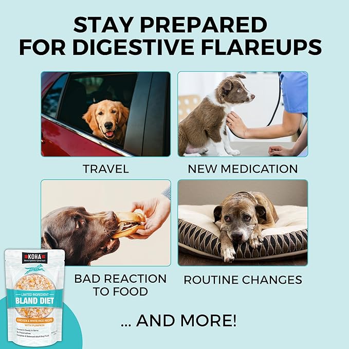 - FOR CHRONIC UPSET STOMACH OR FLAREUPS: Whether your dog suffers from chronic digestive issues, or is experiencing a flareup from things like stress, medication, or travel, KOHA Bland Diet can be fed to help get their tummy back on track!