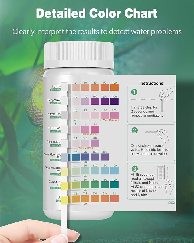 - Easy to Use: First, immerse the water test strip into water sample for 2 sec. Second, take out the strip and lay it flat. Wait 15 sec for results of pH, Cl2, KH, GH, TAL, Fe and Cu, and 60 sec for results of NO2 and NO3. Last, compare the results with the color chart on the bottle.