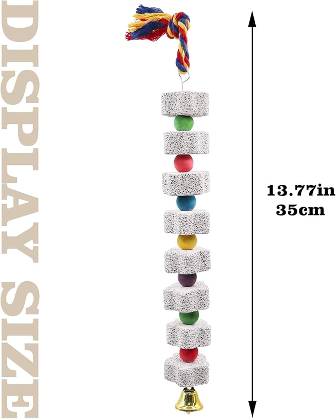 - Extra-Long & Durable Design: Compared to standard bird chew toys, our parrot chewing toy features an extended length (13.77" / 35 cm) with multiple calcium stones, allowing longer use by multiple birds simultaneously.