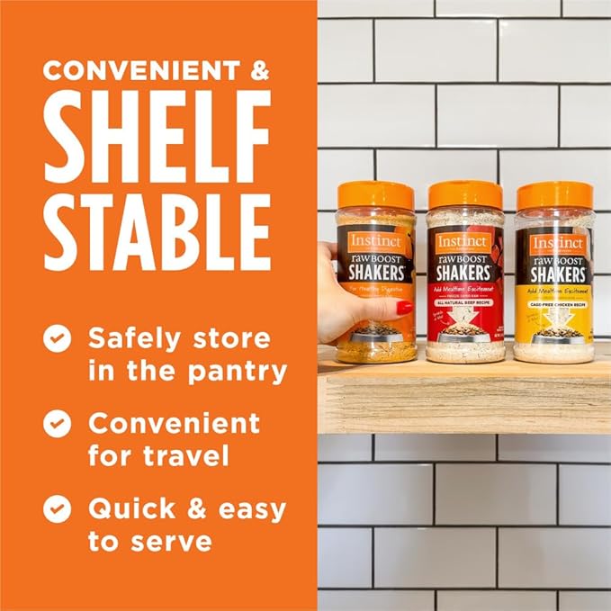 - FREEZE-DRIED RAW DOG FOOD TOPPER FOR DIGESTIVE HEALTH: Add the power of raw plus gut health support to your dog’s kibble with Instinct Raw Boost Shakers Gut Health Recipe. Made with cage-free chicken, non-GMO vegetables & fruits, and functional ingredients like pumpkin, sweet potato, chicory root, apple cider vinegar, and probiotics.