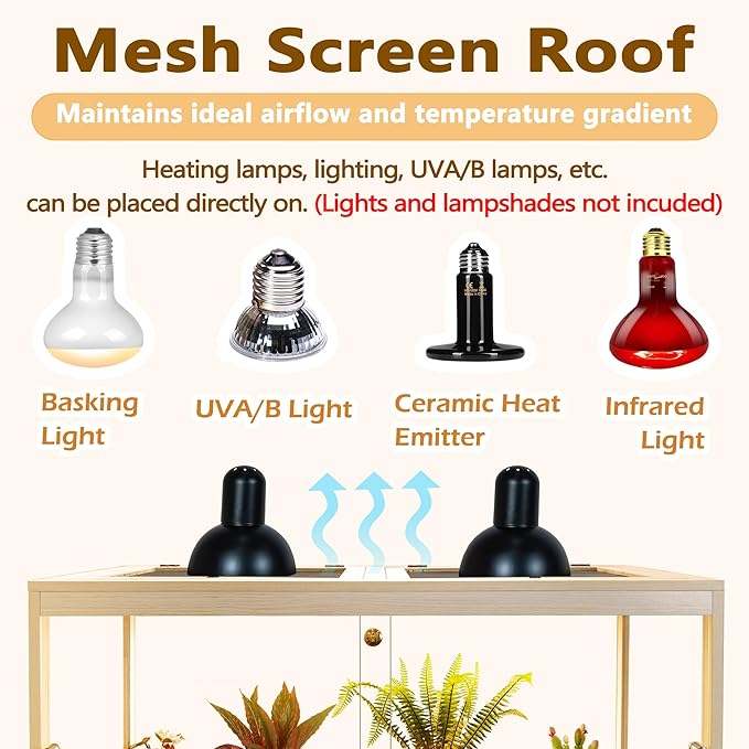 - 【Functional Elegance】Designed with functionality in mind, our reptile terrarium features double sliding front doors that can be effortlessly opened or secured with a lock to prevent escape attempts. The top is fitted with sturdy metal mesh, allowing for proper ventilation and accommodating the direct placement of heat lamps and UVA/B lights (not included) to ensure optimal temperature regulation.