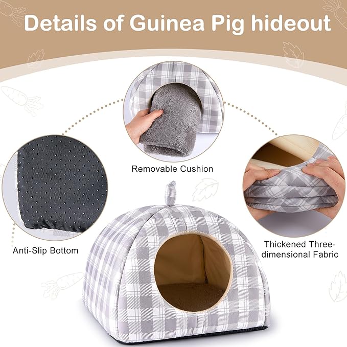 - Soft and Warm Bed: This guinea pig house with a thick and soft cushion, can ensure that your pet in winter life more comfortable and warm; Non-slip bottom design, secure the guinea pig hideout house into position anywhere in your pet's cage