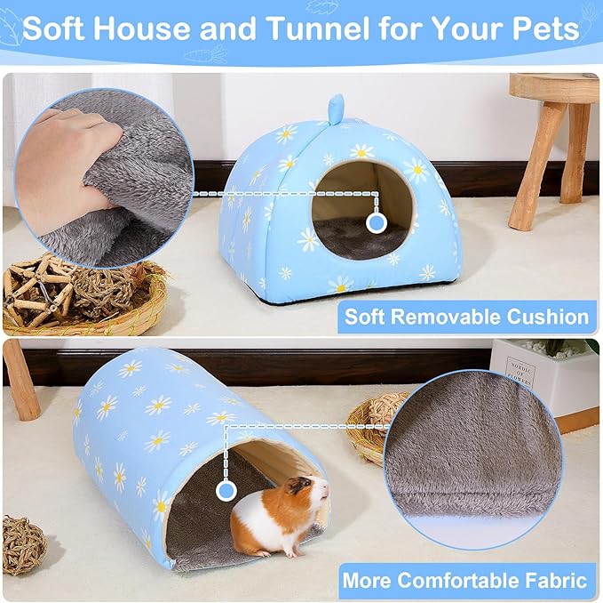 Bienbee Guinea Pig Hideout, Washable Rabbit Bed with Guinea Pig Tunnel, 2 Pack Guinea Pigs Toys Set Bunny Hideout Cage Accessories for Hamster Ferret Rabbits Bunny, Blue Daisy