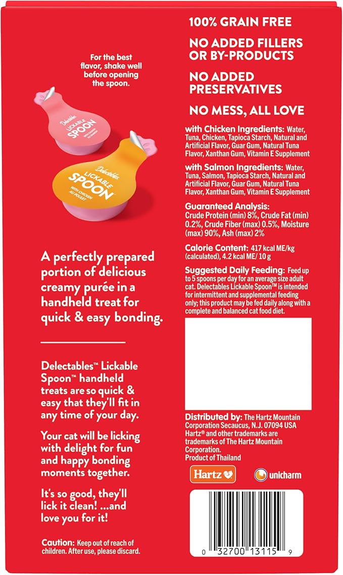 Delectables Lickable Spoon Handheld Wet Cat Treats Made with Real Salmon, Quick & Easy Creamy Puree, Mess Free, Grain-Free, No Added Fillers, No By-Products, No Added Preservatives, Variety Pack, 32ct