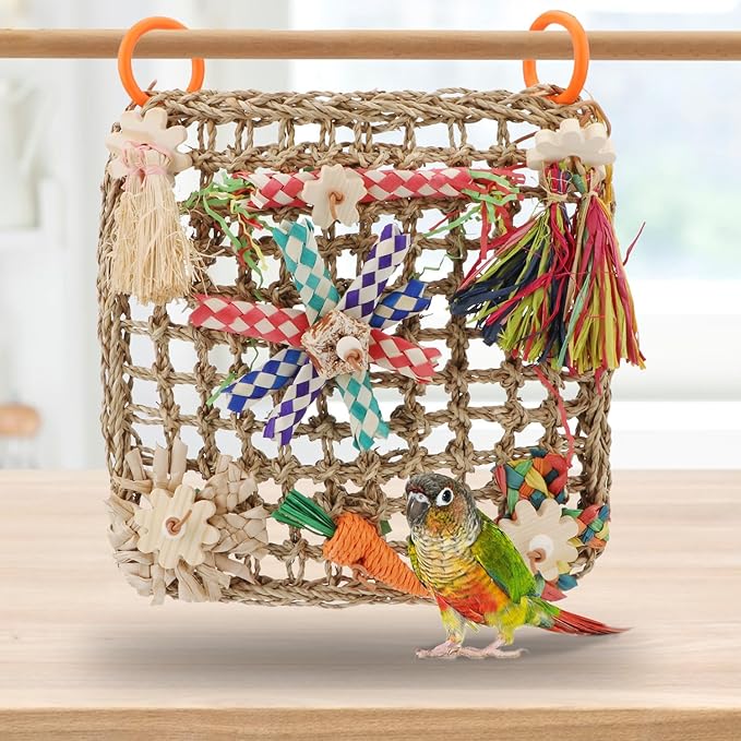 - BIRD TOYS THAT UNLEASH NATURAL INSTINCTS: Designed to satisfy your bird's natural foraging instincts! Made of natural seagrass, hand-woven into a sturdy lattice shape, just like bird foraging toys should be. It's not only a climbing mat but also a foraging paradise for your feathered friend. With a variety of colorful toys attached, it's perfect for your budgies, cockatiels, conures, parakeets, lovebirds, and other small to medium size birds to tear, forage, and chew. Whether they're small parrots like the ones that love our medium-sized Solla ball (11.4x7.8in / 29x20cm) or need the larger Carrot size (11.8x11.8in / 30x30cm), this is an ideal choice.
