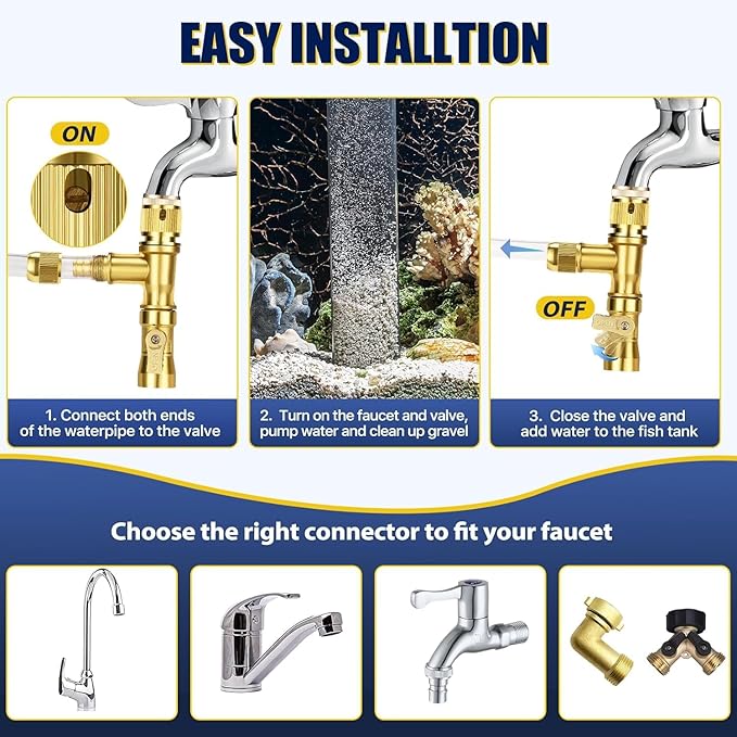 - 【No Buckets, No Spill, No Noise】Easy to install and simple operation, no bucket required, the dirty water in the fish tank is drawn out under the pressure of tap water, After the drain is completed, just switch the valve to add water.