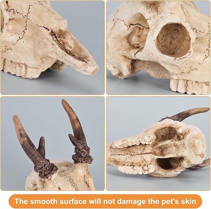 - 1.PRODUCT SAFETY IS MOST IMPORTANT: Our this Elk Skulll Decoration is polished and will not harm your pet's skin or scales, very safe. The irregular antlers and small holes can help lizards, leopard geckos and snakes better complete their natural moult.
