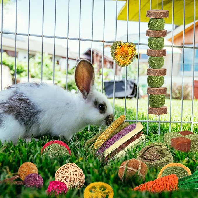 - 18 DIFFERENT CHEW TOYS: A nice assortment of hay and wild flower pressed chews,apple stick chews,bamboo sticks chews and rope type chews.YIXUND rabbit toys includ 3 heart green timothy biscuits,2 green dried grasses balls,2 lollipops,1 seagrass ball,1 wicker ball,1 apple wood molar string,1 wicker carrots,apple sticks,sweet bamboo sticks and timothy hay sticks.