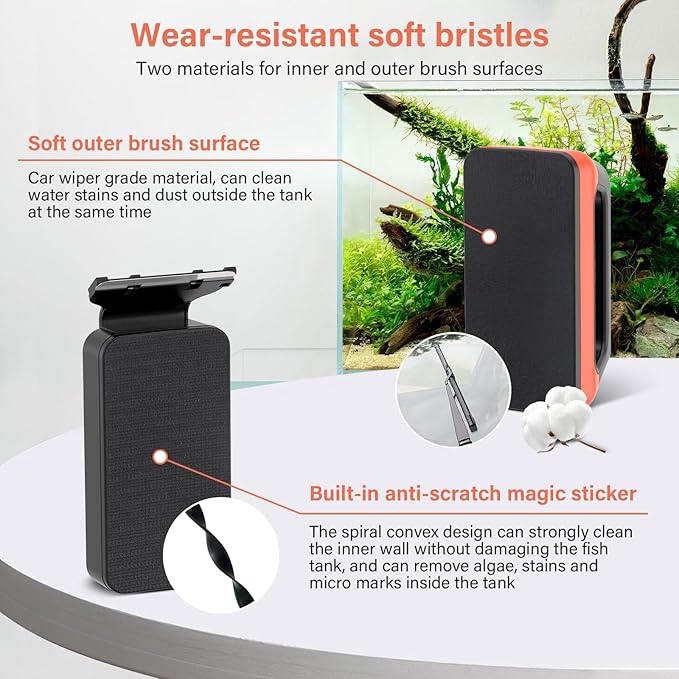 - The fish tank can be cleaned on both sides. The outer brush is soft velvet, which can be used to clean external dust and fingerprints. The inner brush is a strong cleaning brush that can effectively clean the algae on the inner wall of the fish tank. You can use only the outer brush or the inner and outer brushes together according to the cleanliness of the fish tank