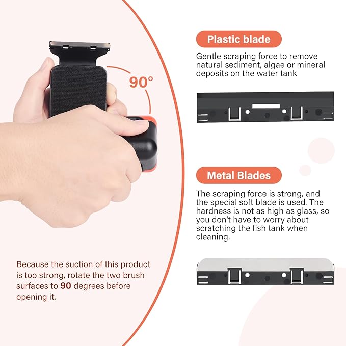 - The handle design allows you to hold the fish tank cleaner while cleaning. When the fish tank is slightly covered with green algae, it can be cleaned in one go, and hard spots require several cleanings to remove. Please note: Do not clean the fish tank horizontally when the scraper is installed to avoid scratching the glass