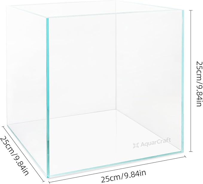 - [ Dimensions & Package ] The dimensions of this fishtank are 10”L x 10”W x 10”H(25x25x25cm)with a capacity of 4.1 gallons. This is a cube nano fish tank, perfect for keeping betta / Goldfish / Shrimp/ Snail.