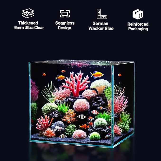 - [ Seamless Design and Superior Strength ] rimless aquarium features a seamless edge design and uses German Wacker 103 glue for strength and Cube tank durability. Additionally, the glass thickness is increased to 6mm, and the edges are safety beveled to make small aquarium edges smoother and more rounded.