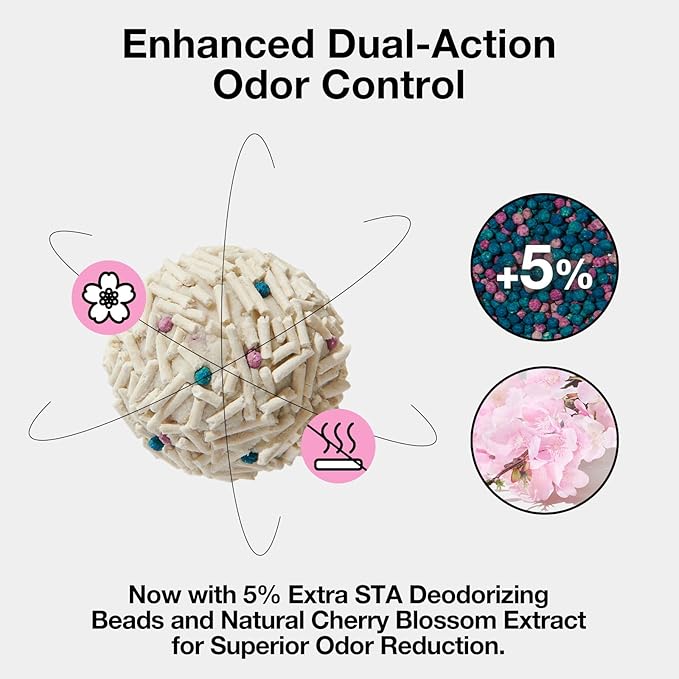- 【Superior Odor Control】This tofu litter is infused with natural cherry blossom plant extract, which can help mask unpleasant odors. Plus, extra added 5% deodorizing beads that effectively control odors, ensuring a fresh and odor-free space