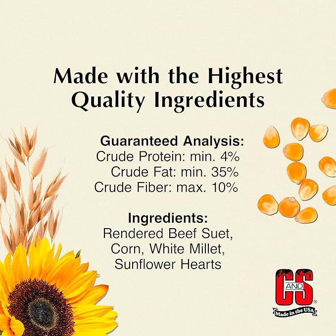 - ECONOMICAL AND EASY TO USE compared to traditional seeds; C&S Products Sunflower Suet combined with a wire feeder offers a great value for today’s wild bird feeding customer