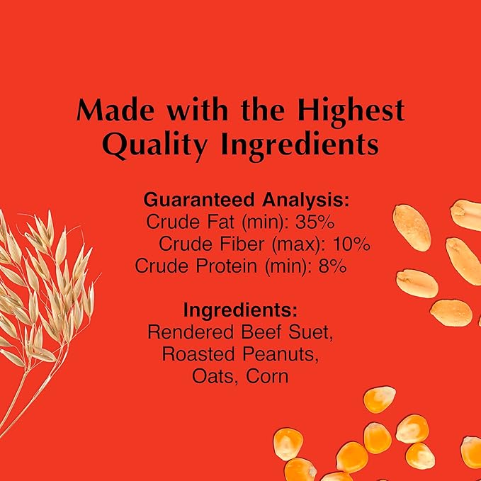- MADE WITH ROASTED PEANUTS for a balanced and nutritious diet; suet cakes offer a nutritious, energy-rich food source essential birds need to forage, nest, migrate and more