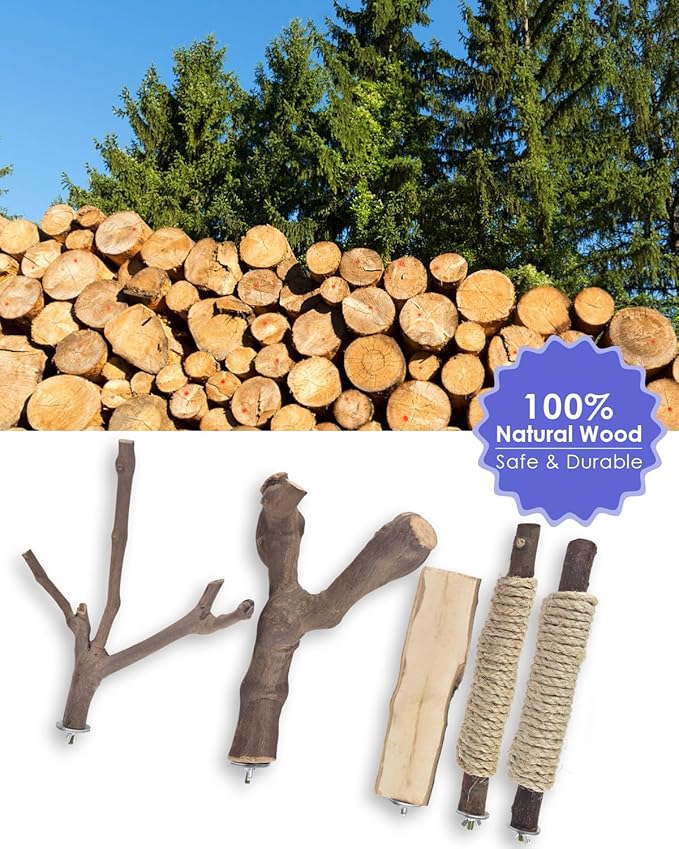 - Natural Materials: Parrot perches are made of FSC-Certified wood, like natural grapevines and solid wood, without paint or chemical odor. It is non-toxic, harmless, safer and more durable, in line with the living habits of birds