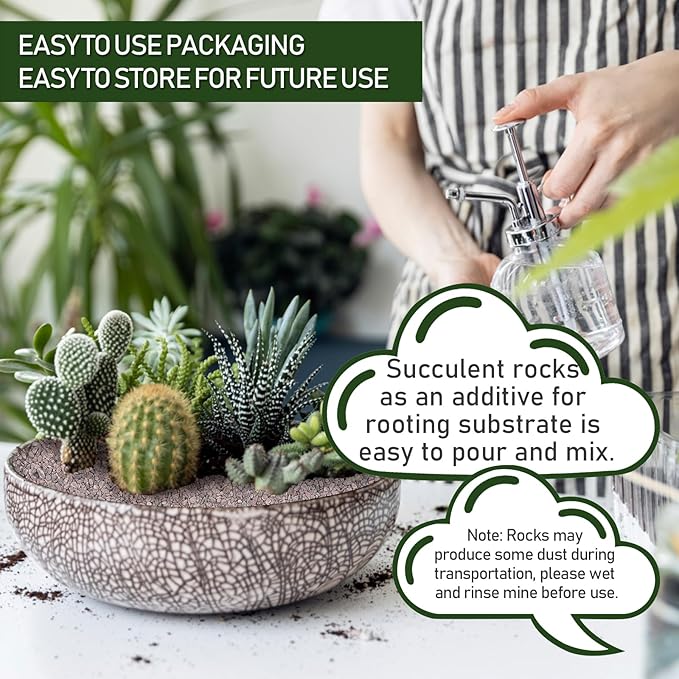 - Amazing Soil Conditioner - keep your plant babies growing healthily and happily! If you live in a compacted soil area and have never used succulent rocks which a rocks deposited in lakes and seas, crystalline, pure, and light., then you are out of fashion. You just need to mix it with your soil, and it will immediately improve the soil's quality. It can loosen the soil and allow water to deeply penetrate the ground, allowing plants to firmly take root.