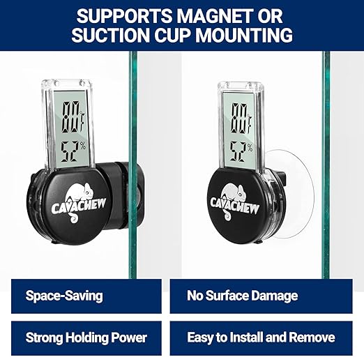 - Powerful Magnetic Mounting: This reptile thermometer features a strong magnetic back, allowing for effortless installation and ensuring secure attachment without falling, also come with suction cup for option. Suitable for reptile terrarium of different materials. Plus, Compact reptile thermometer and humidity checker is perfect for any size habitat, without taking up unnecessary space