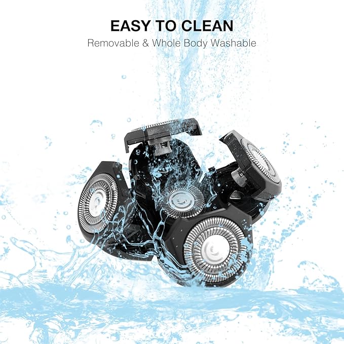 - 【Easy to Clean】The washable rotary shaver head for bald men simplifies maintenance. Twist each blade clockwise to open and rinse the inside under running water, ensuring cleanliness and prolonging the head's lifespan.