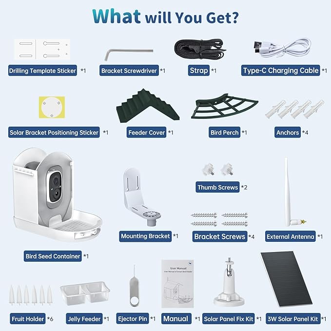 - 【Cloud Storage & SD Card】Our bird camera feeder supports cloud storage (30 days trial) and SD card dual storage(MAX 128, not included),The bird watching camera saves every captured bird-feeding clip to the cloud or an SD card, never miss a bird-watching moment