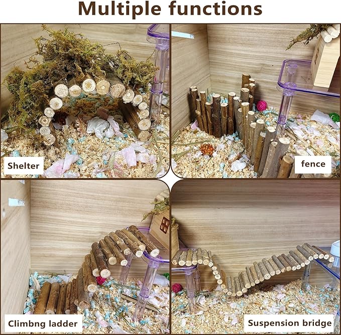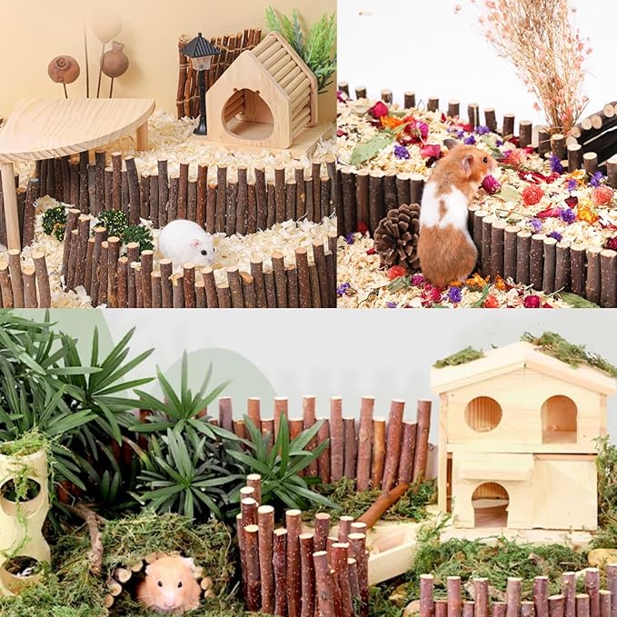 - [Hamster cage decoration] : The hamster wooden fence retains the original wood flavor, and creates a hamster play place, which can be placed horizontally as a wooden bridge for pets to sleep and climb; Short fences can be used as large tunnels for pets to hide and play in